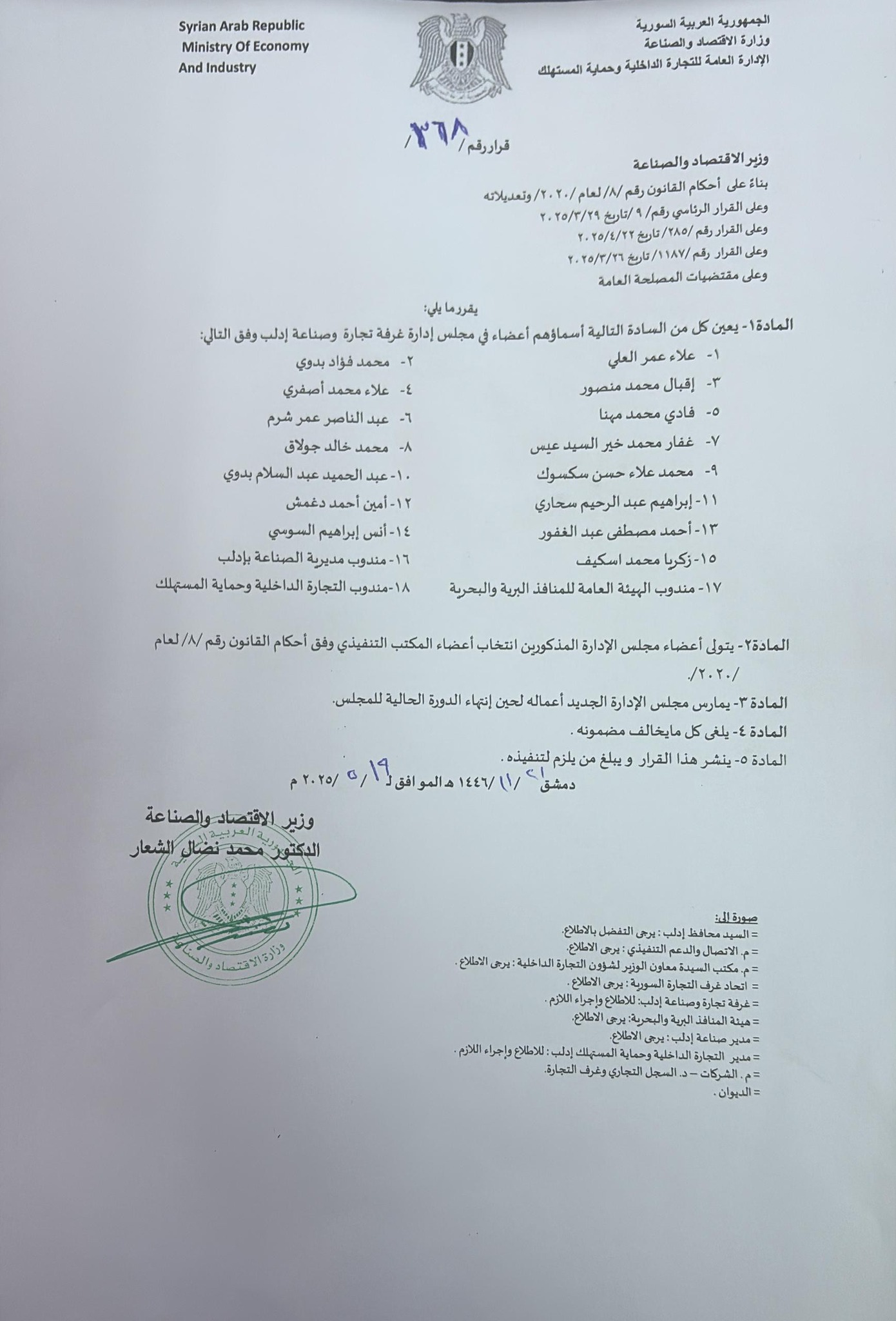 وزارة الاقتصاد والصناعة: قرار رقم /368/ القاضي بتعيين أعضاء مجلس إدارة غرفة تجارة وصناعة إدلب
