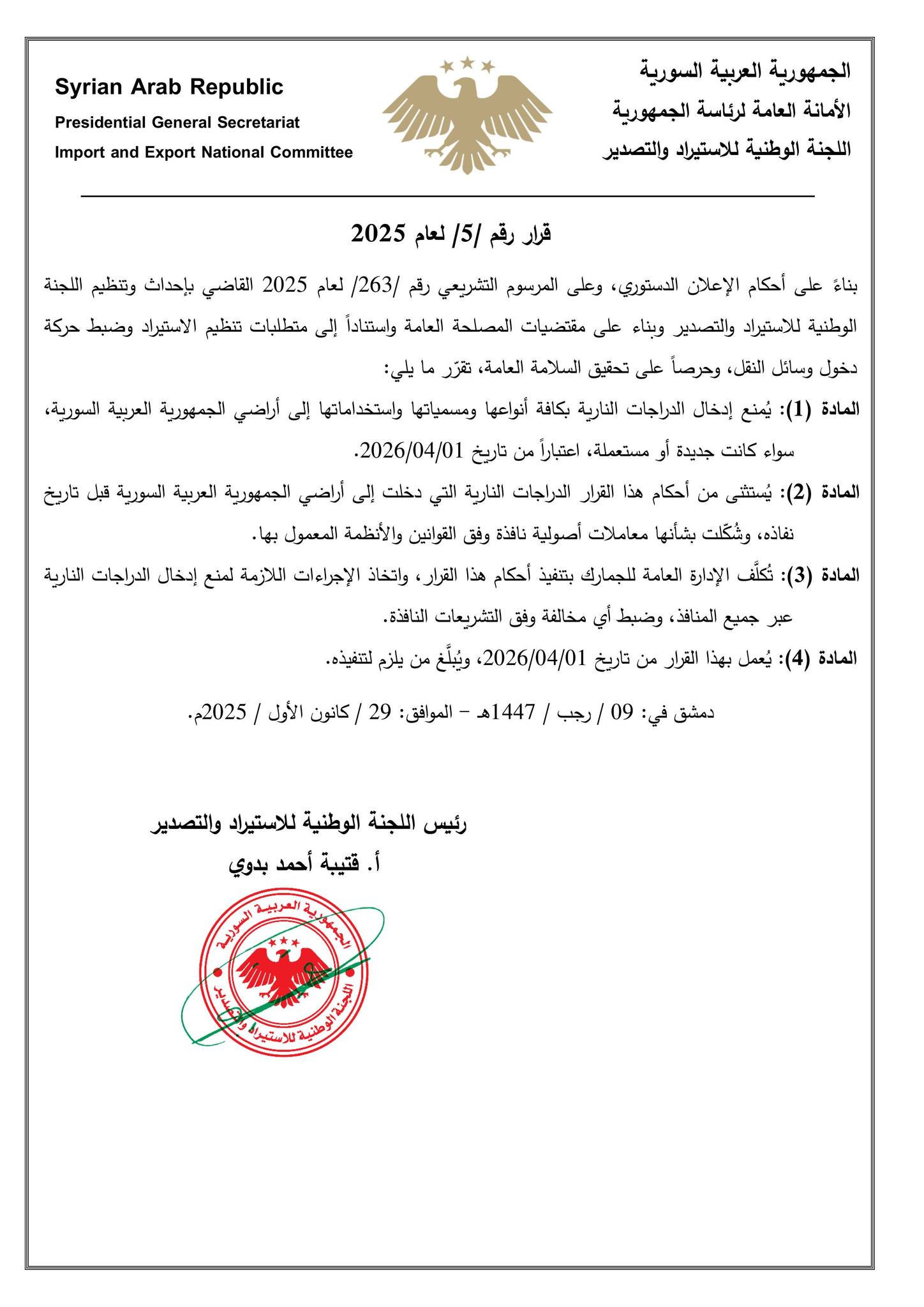 بناءً على أحكام الإعلان الدستوري، وعلى المرسوم التشريعي رقم /263/ لعام 2025 القاضي بإحداث وتنظيم اللجنة الوطنية للاستيراد والتصدير، وبناءً على مقتضيات المصلحة العامة واستناداً إلى متطلبات تنظيم الاستيراد وضبط حركة دخول وسائل النقل، وحرصاً على تحقيق السلامة العامة، تقرر ما يلي: