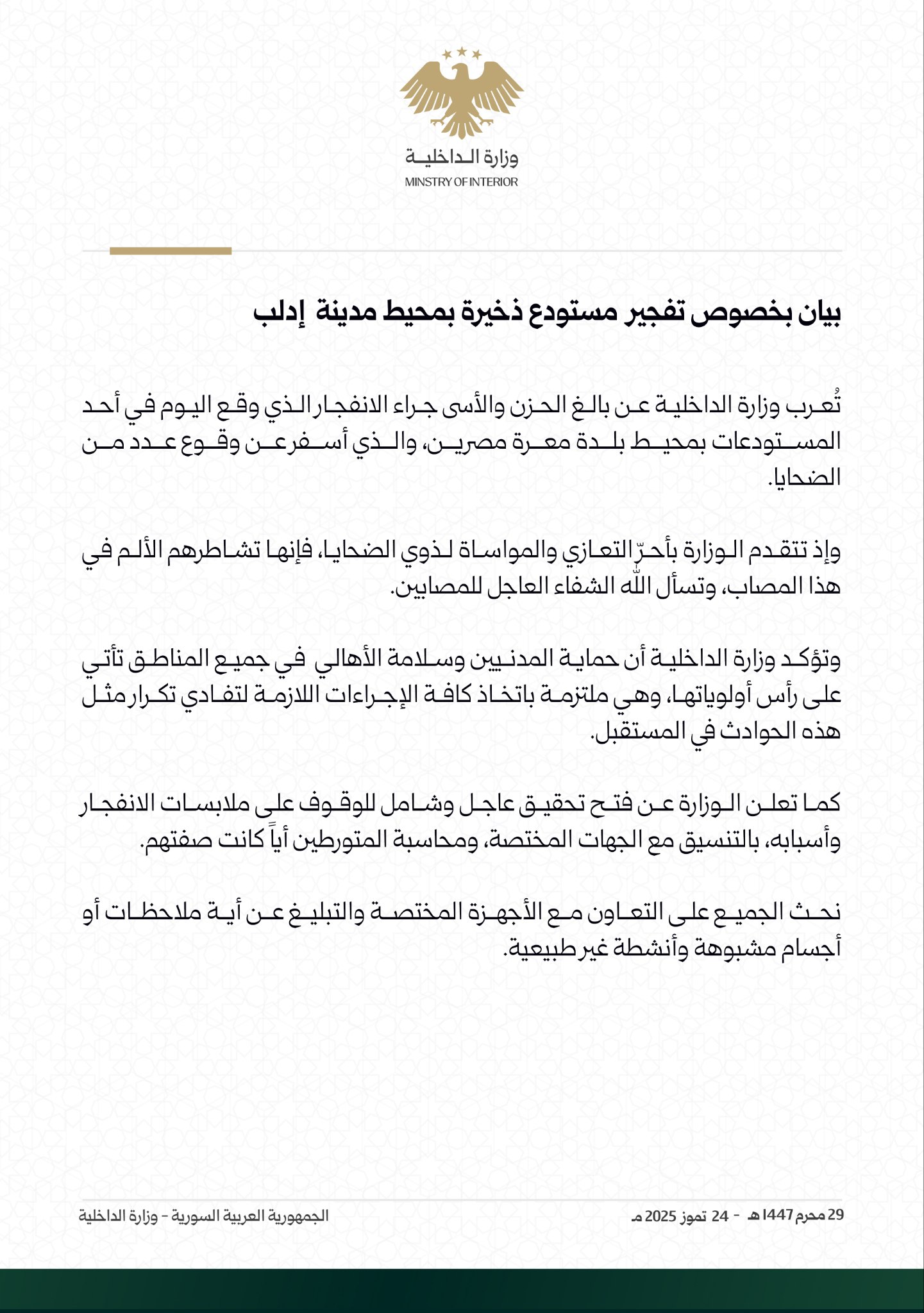 تعرب وزارة الداخلية عن بالغ الحزن والأسى جراء الانفجار الذي وقع اليوم في أحد المستودعات بمحيط بلدة معرة مصرين، والذي أسفر عن وقوع عدد من الضحايا.