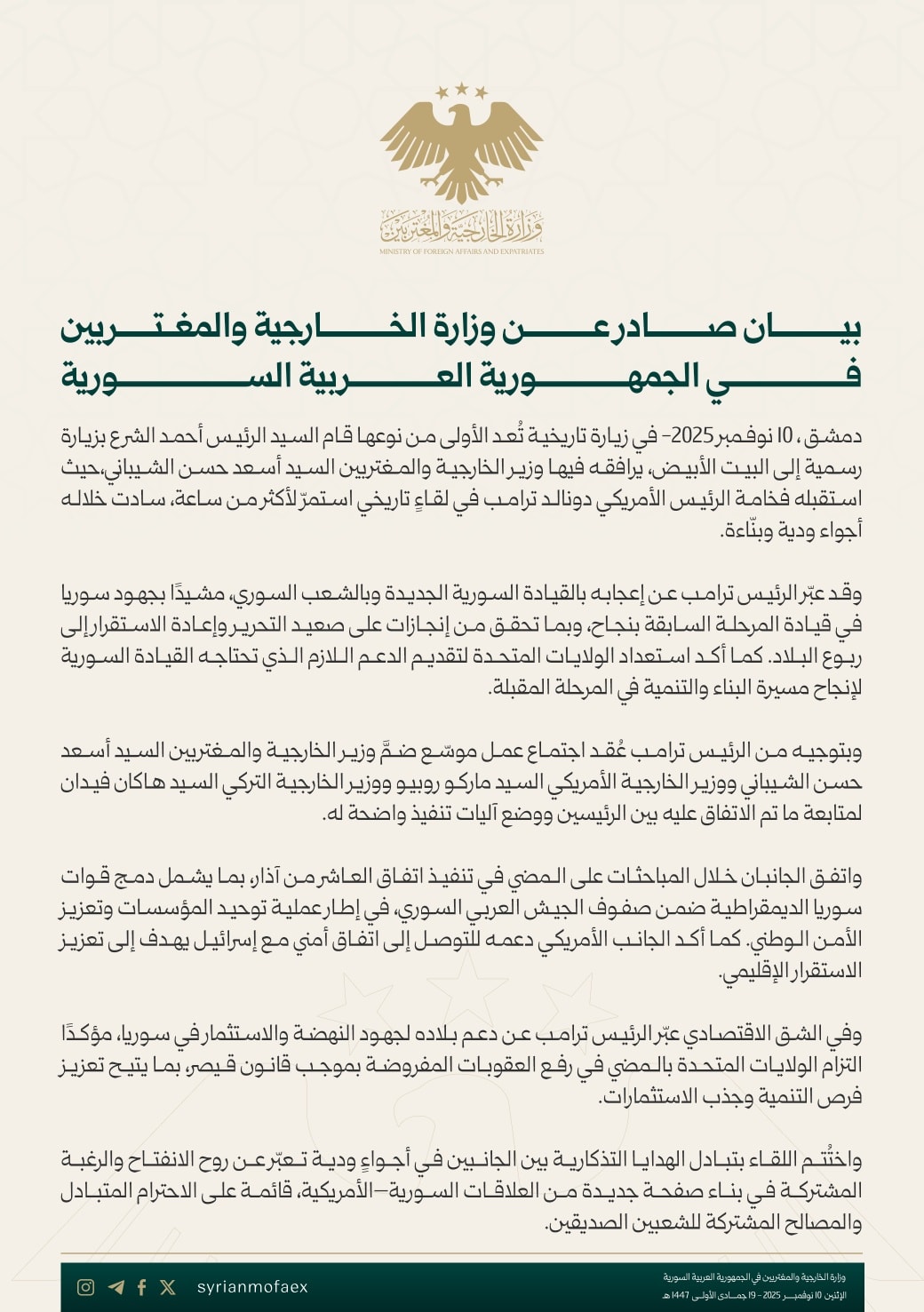 وزارة الخارجية والمغتربين السورية: بيان حول زيارة الرئيس أحمد الشرع الرسمية إلى الولايات المتحدة الأمريكية ولقائه الرئيس الأمريكي