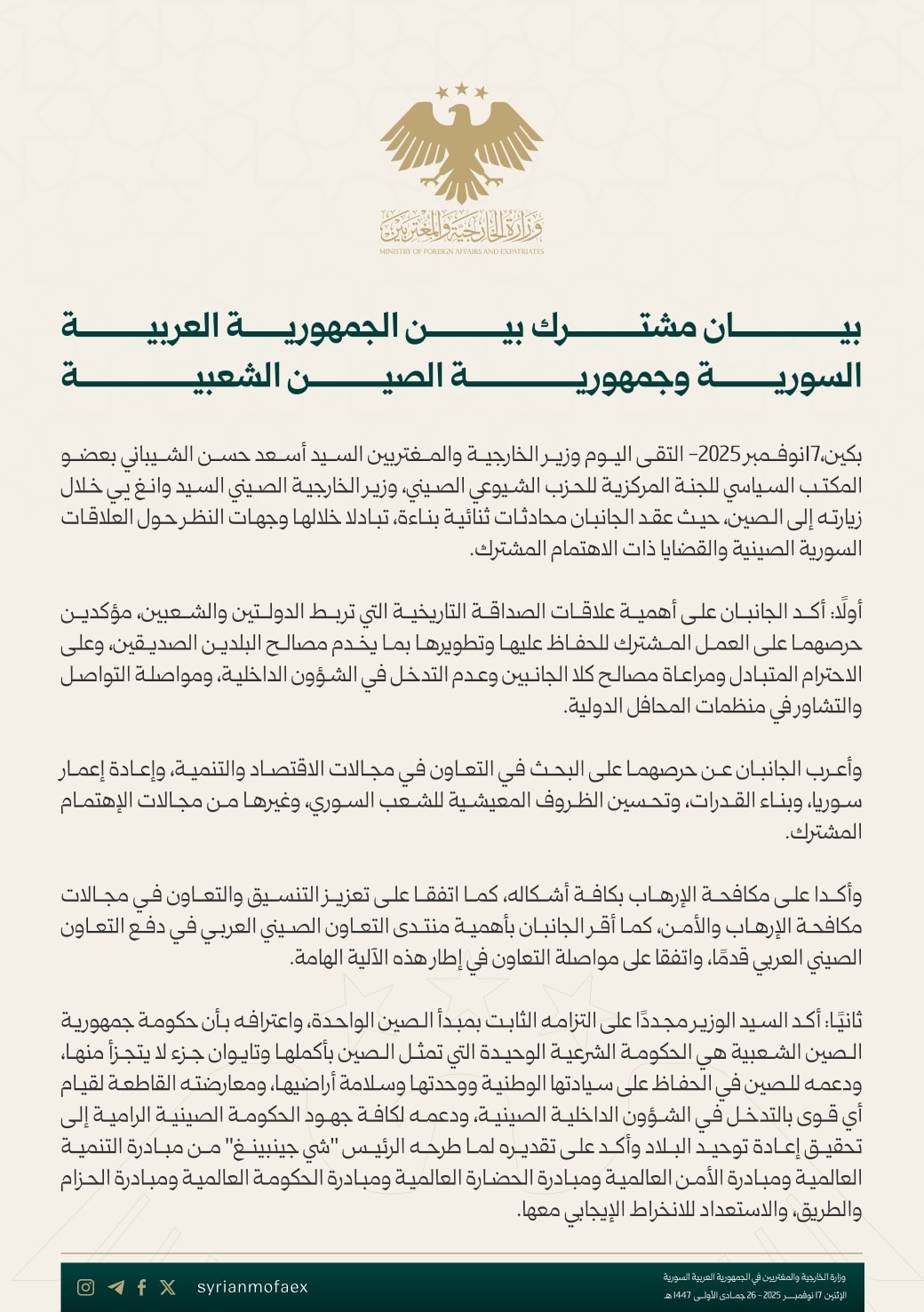 وزارة الخارجية والمغتربين السورية: بيان مشترك سوري–صيني حول تعزيز العلاقات الثنائية، دعم مبدأ الصين الواحدة، والتعاون في مكافحة الإرهاب والتنمية
