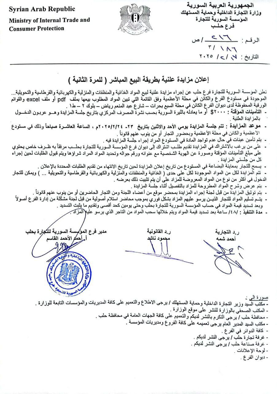 تعلن المؤسسة السورية للتجارة فرع حلب عن إجراء مزايدة علنية لبيع المواد الغذائية والمنظفات والمنزلية والكهربائية والقرطاسية والتحويلية الموجودة في مستودع الفرع والكائن في محلة الأعظمية وفق القائمة التي تبين المواد المطلوب بيعها بملف pdf وملف excel والقوائم الورقية المحفوظة بديوان الفرع والكائن في محلة الأعظمية بحارات شارع النصر من الجهة الشمالية طابق أول.