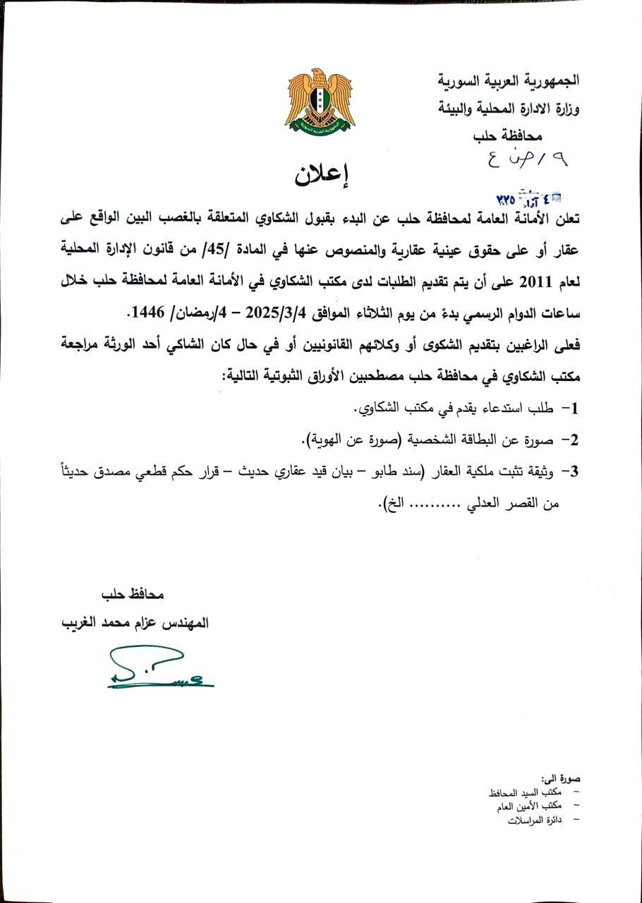 تعلن الأمانة العامة لمحافظة حلب عن البدء بقبول الشكاوى المتعلقة بالغصب البيّن الواقع على عقار أو على حقوق عينية عقارية والمنصوص عنها في المادة /45/ من قانون الإدارة المحلية لعام 2011 على أن يتم تقديم الطلبات لدى مكتب الشكاوى في الأمانة العامة لمحافظة حلب خلال ساعات الدوام الرسمي بدءاً من يوم الثلاثاء الموافق 4/3/2025 – 4/رمضان/1446.