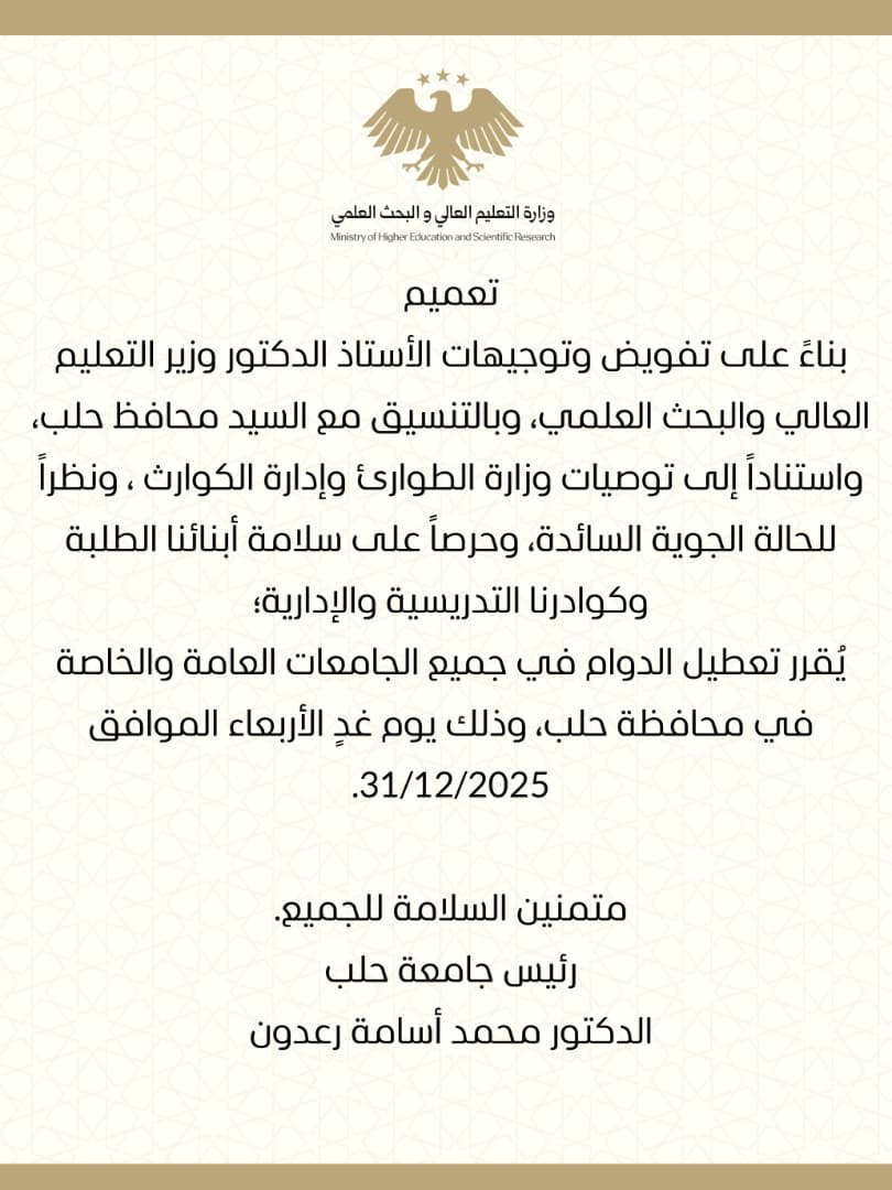 يُقرر تعطيل الدوام في جميع الجامعات العامة والخاصة في محافظة حلب، وذلك يوم غدٍ الأربعاء الموافق 31/12/2025.