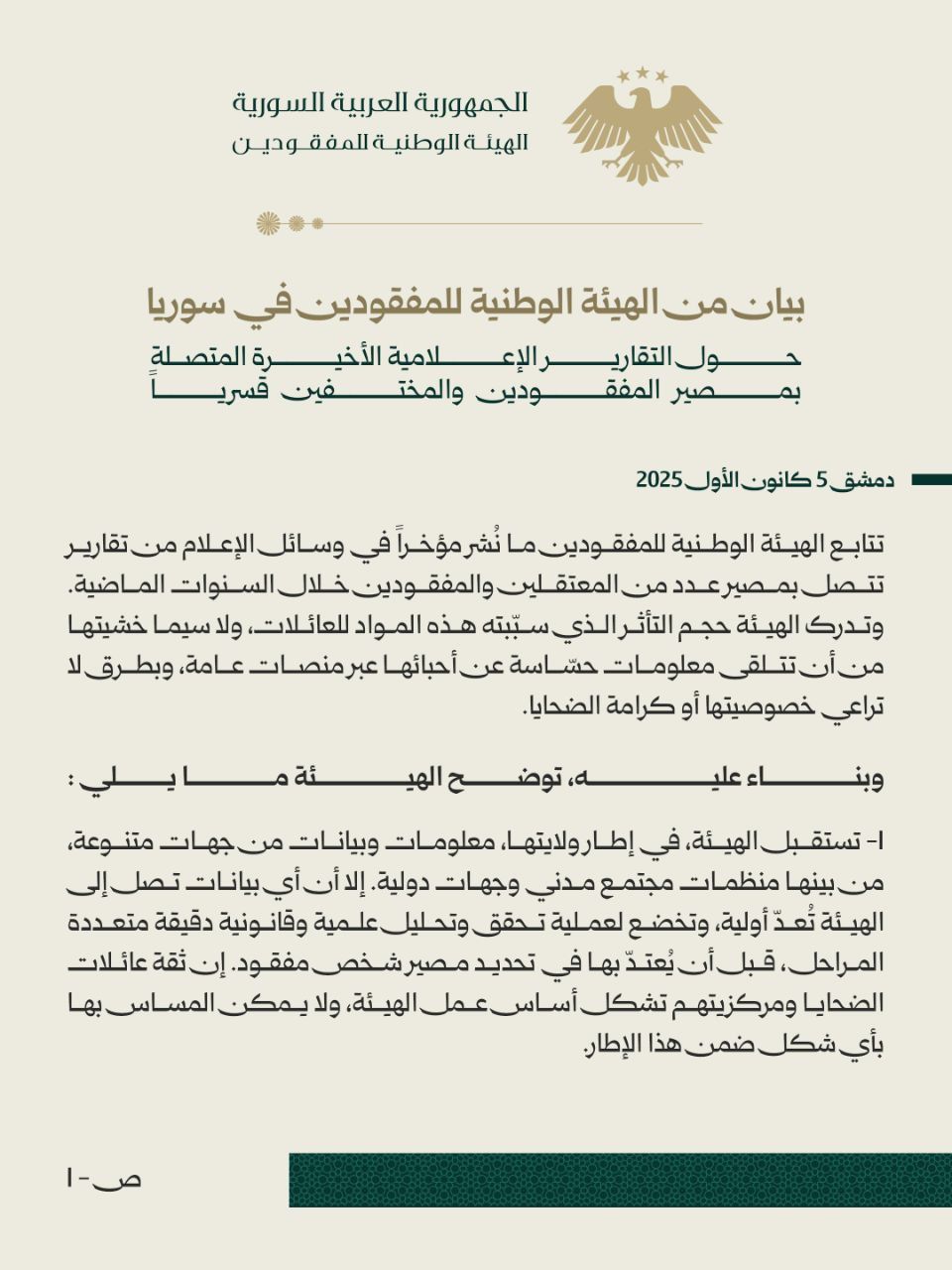 بيان من الهيئة الوطنية للمفقودين في سوريا