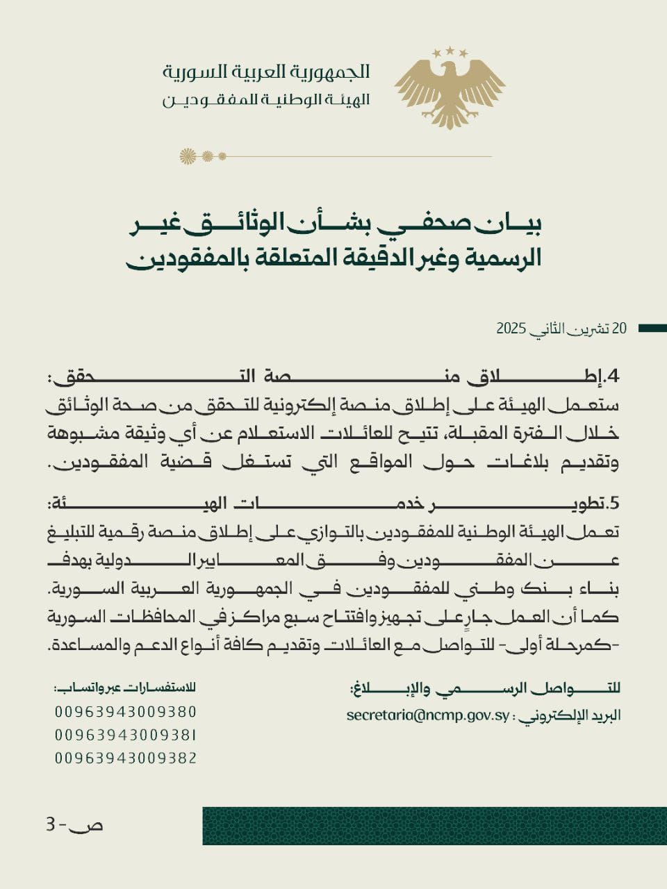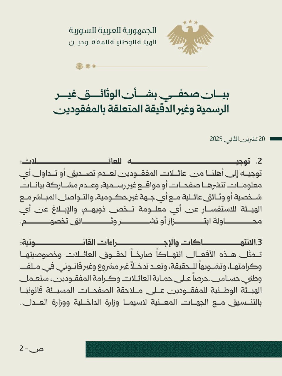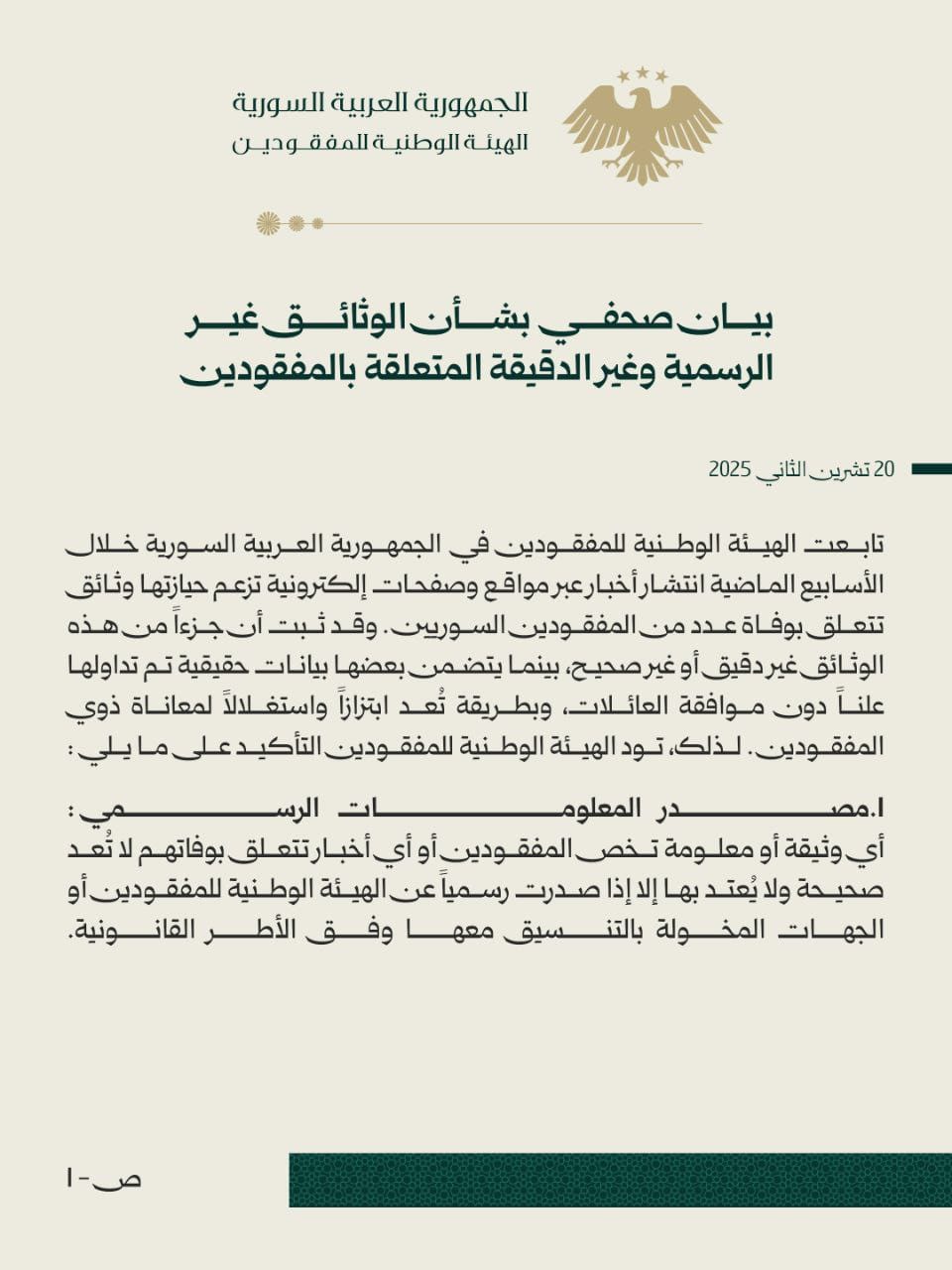 تابعت الهيئة الوطنية للمفقودين في الجمهورية العربية السورية خلال الأسابيع الماضية انتشار أخبار عبر مواقع وصفحات إلكترونية تزعم حيازتها وثائق تتعلق بوفاة عدد من المفقودين السوريين. وقد تبيّن أن جزءاً من هذه الوثائق غير دقيق أو غير صحيح، بينما يتضمن بعضها بيانات حقيقية تم تداولها علناً دون موافقة العائلات، وبطريقة تُعد ابتزازاً واستغلالاً لمعاناة ذوي المفقودين. لذلك، تود الهيئة الوطنية للمفقودين التأكيد على ما يلي: