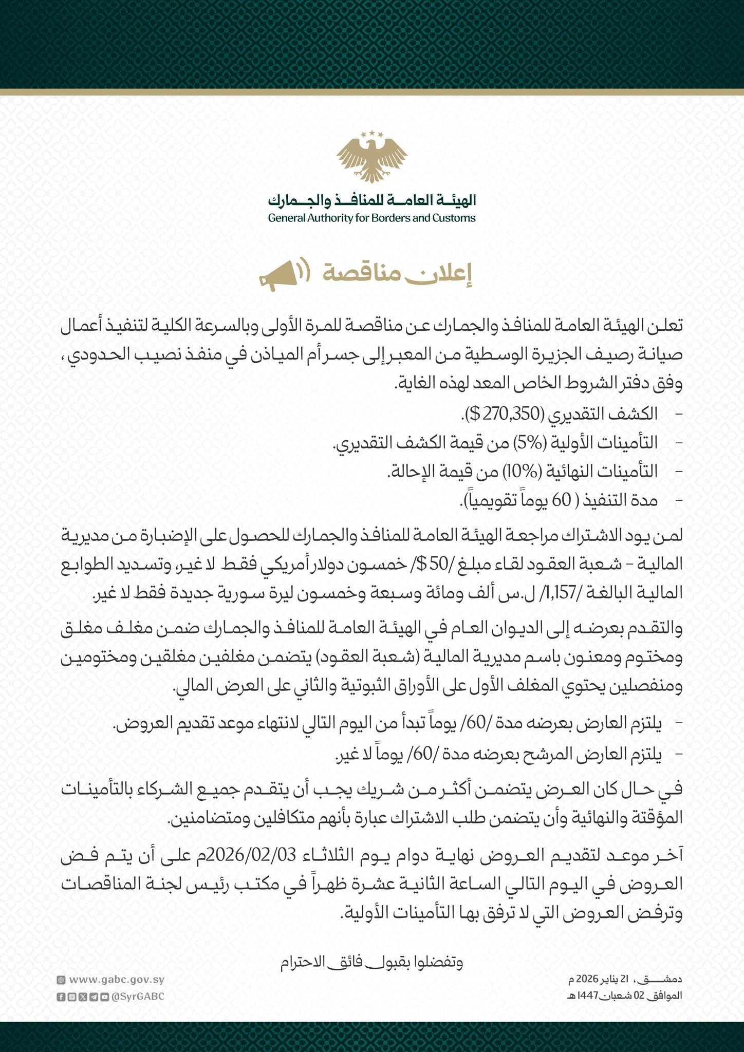 تعلن الهيئة العامة للمنافذ والجمارك عن مناقصة للمرة الأولى وبالسرعة الكلية لتنفيذ أعمال صيانة رصيف الجزيرة الوسطية من المعبر إلى جسر أم الميدان في منفذ نصيب الحدودي، وفق دفتر الشروط الخاص المعد لهذه الغاية.