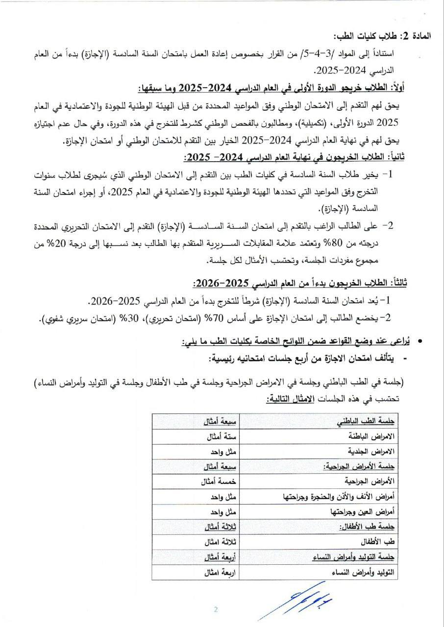 1- يخير طلاب السنة السادسة في كليات الطب بين التقدم إلى الامتحان الوطني الذي سيجري لطلاب سنوات التخرج وفق المواعيد التي تحددها الهيئة الوطنية للجودة والاعتمادية في العام 2025، أو إجراء امتحان السنة السادسة (الإجازة).