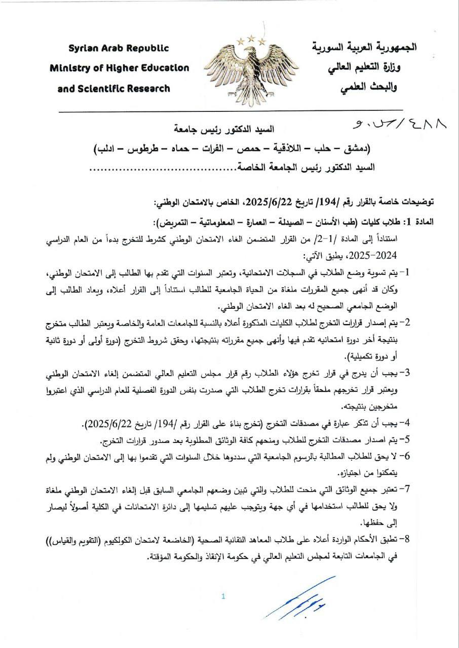 وزارة التعليم العالي والبحث العلمي: القرار رقم /194/ المتضمن توضيحات خاصة بإلغاء شرط الامتحان الوطني وآليات التخرج والقبول في الدراسات العليا لكليات الطب والاختصاصات الصحية