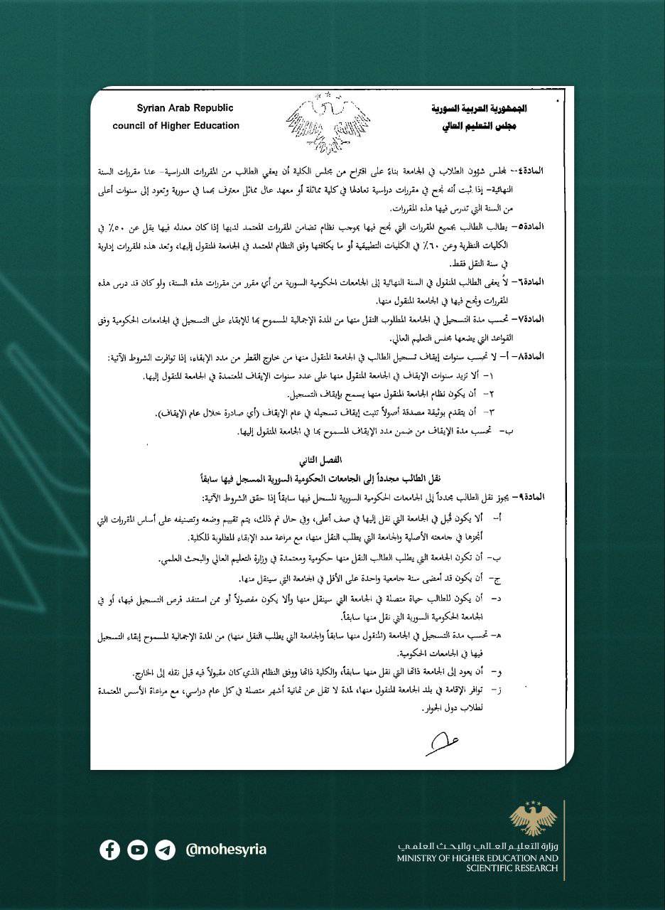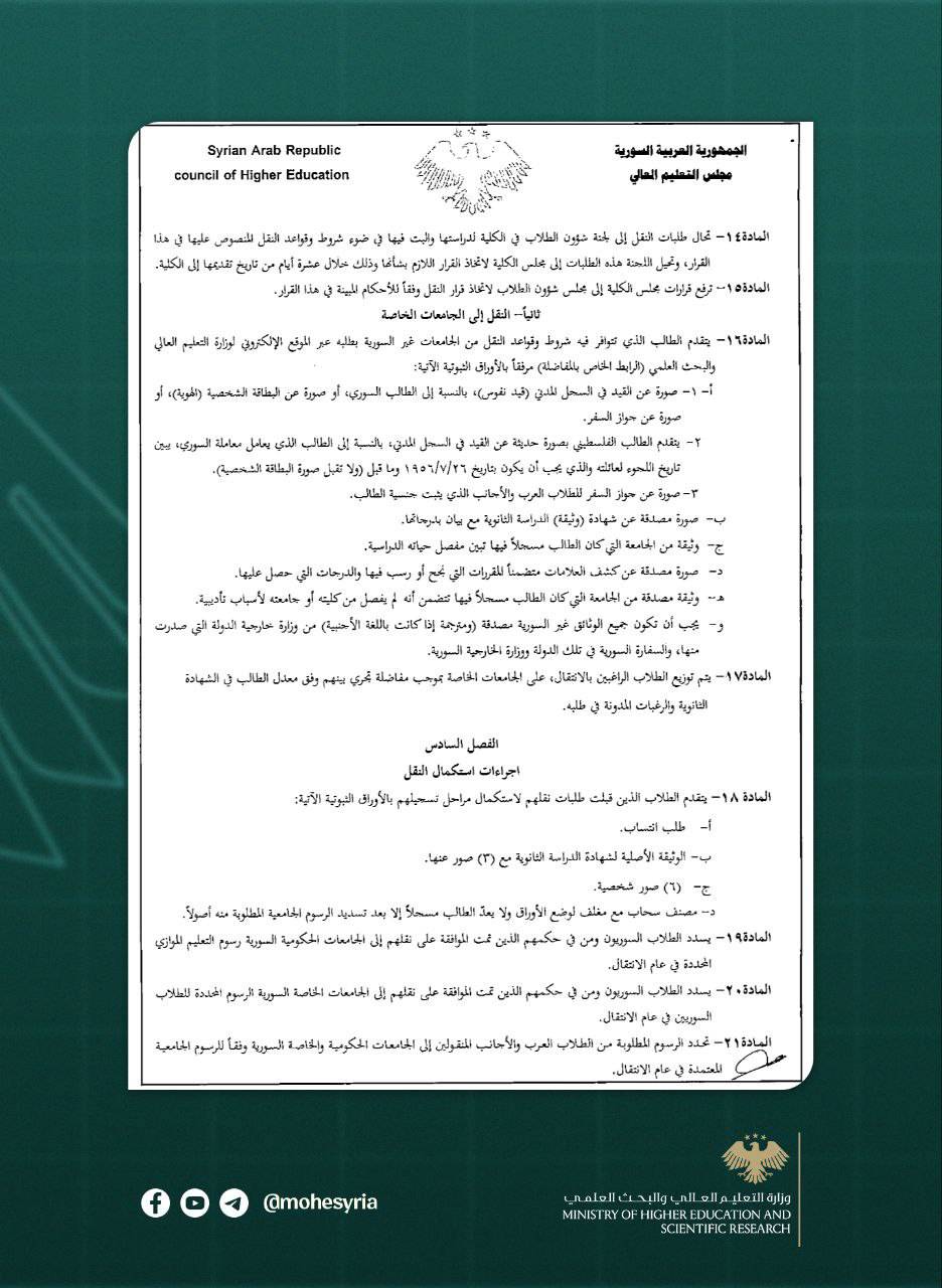 ج- أن يكون الطالب حياته منتظمة في الجامعة التي سينقل منها، وألا يكون مفصولاً أو مستنفد فرص التسجيل فيها أو في الجامعة الحكومية السورية التي نقل منها سابقاً.