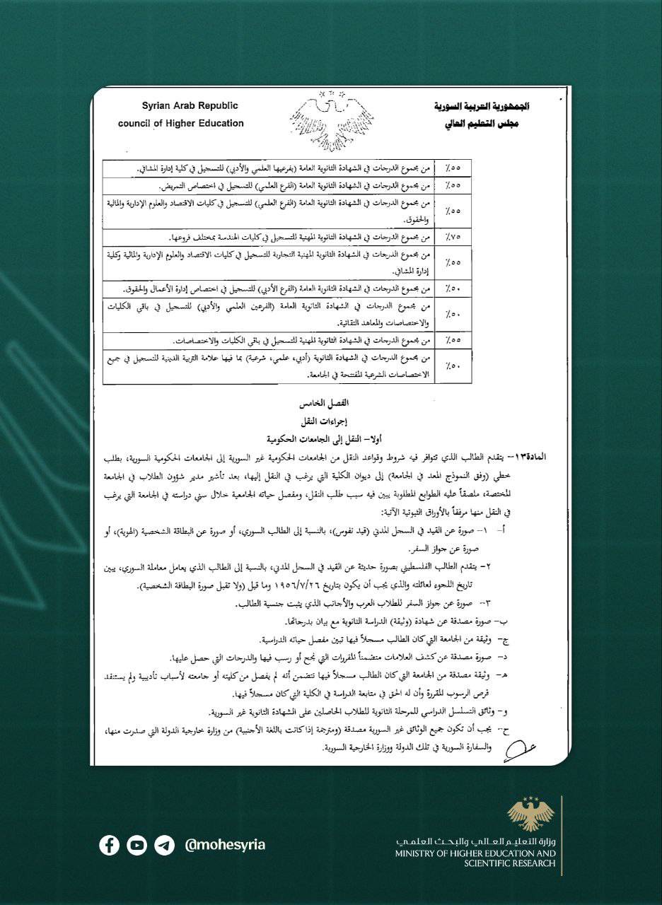 أولاً – قواعد النقل إلى الجامعات الحكومية السورية