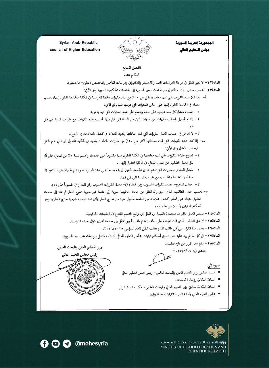 قواعد نقل (تحويل) الطلاب من الجامعات غير السورية إلى الجامعات السورية