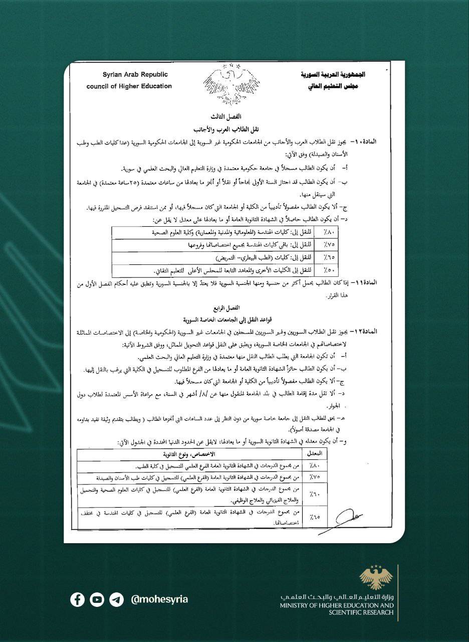 المادة 10 – يجوز نقل الطلاب العرب والأجانب من الجامعات الحكومية وغير الحكومية غير السورية إلى الجامعات الحكومية السورية (عدا كليات الطب وطب الأسنان والصيدلة) وفق الآتي: