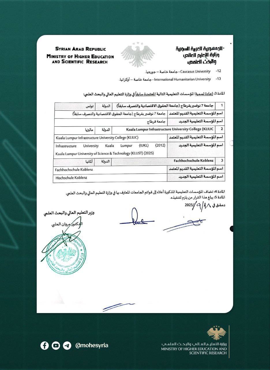 وزارة التعليم العالي والبحث العلمي السورية: القرار رقم /660/ الاعتراف بجامعات ومؤسسات تعليمية حكومية وخاصة وإعادة تسمية مؤسسات تعليمية معتمدة