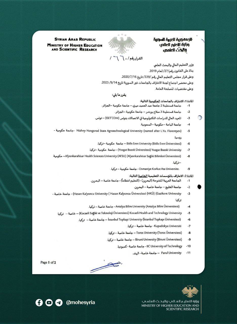 وعلى محضر اجتماع لجنة الاعتراف بالجامعات غير السورية تاريخ 14/9/2025،