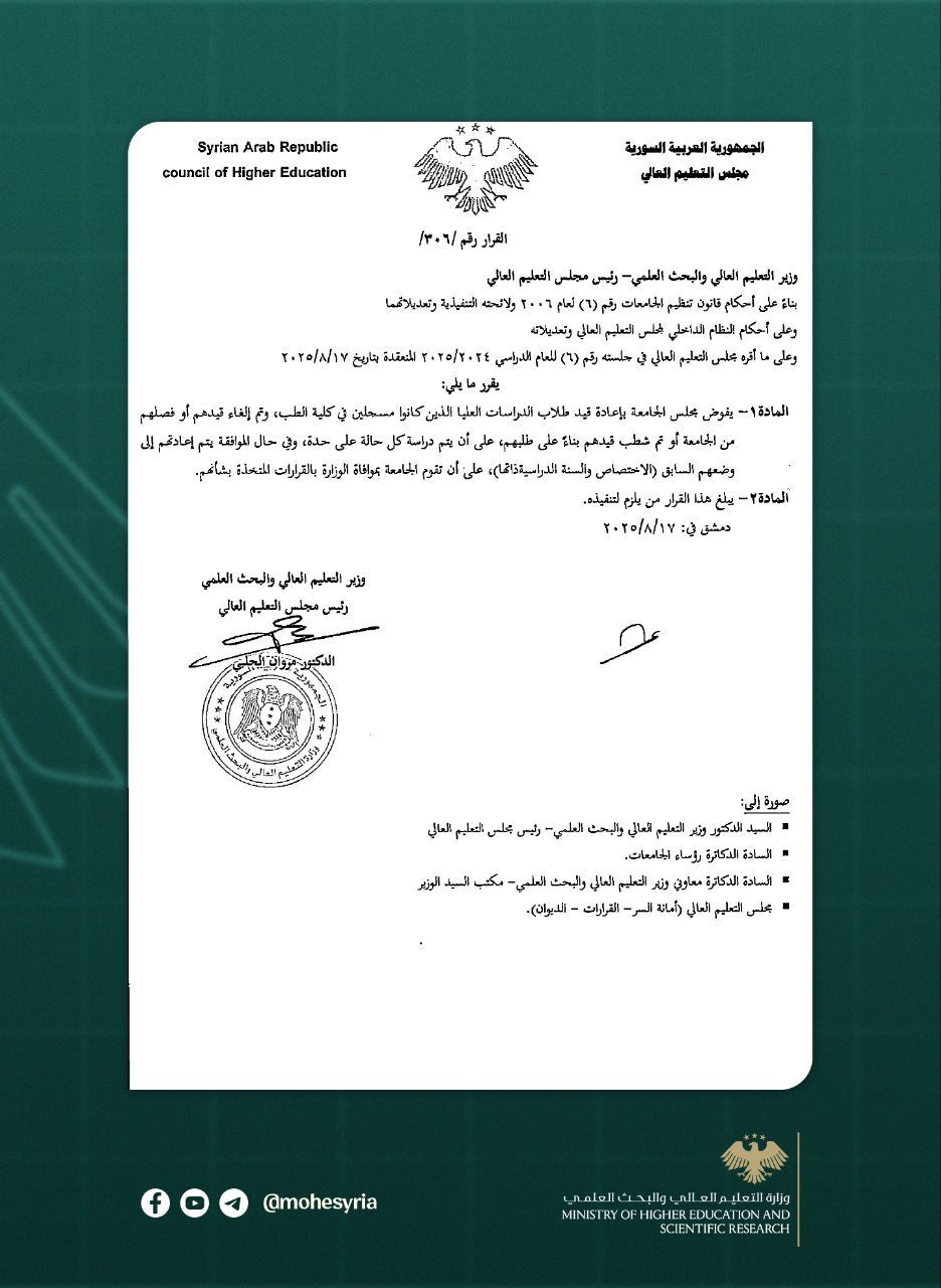 مجلس التعليم العالي: القرار رقم /306/ إعادة قيد طلاب الدراسات العليا في كلية الطب بعد إلغاء قبولهم أو فصلهم