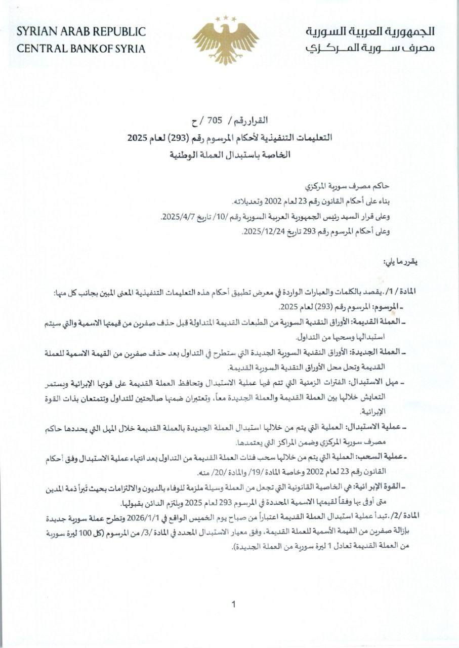 مصرف سورية المركزي: القرار رقم /705/ التعليمات التنفيذية لاستبدال العملة السورية بالعملة الوطنية الجديدة