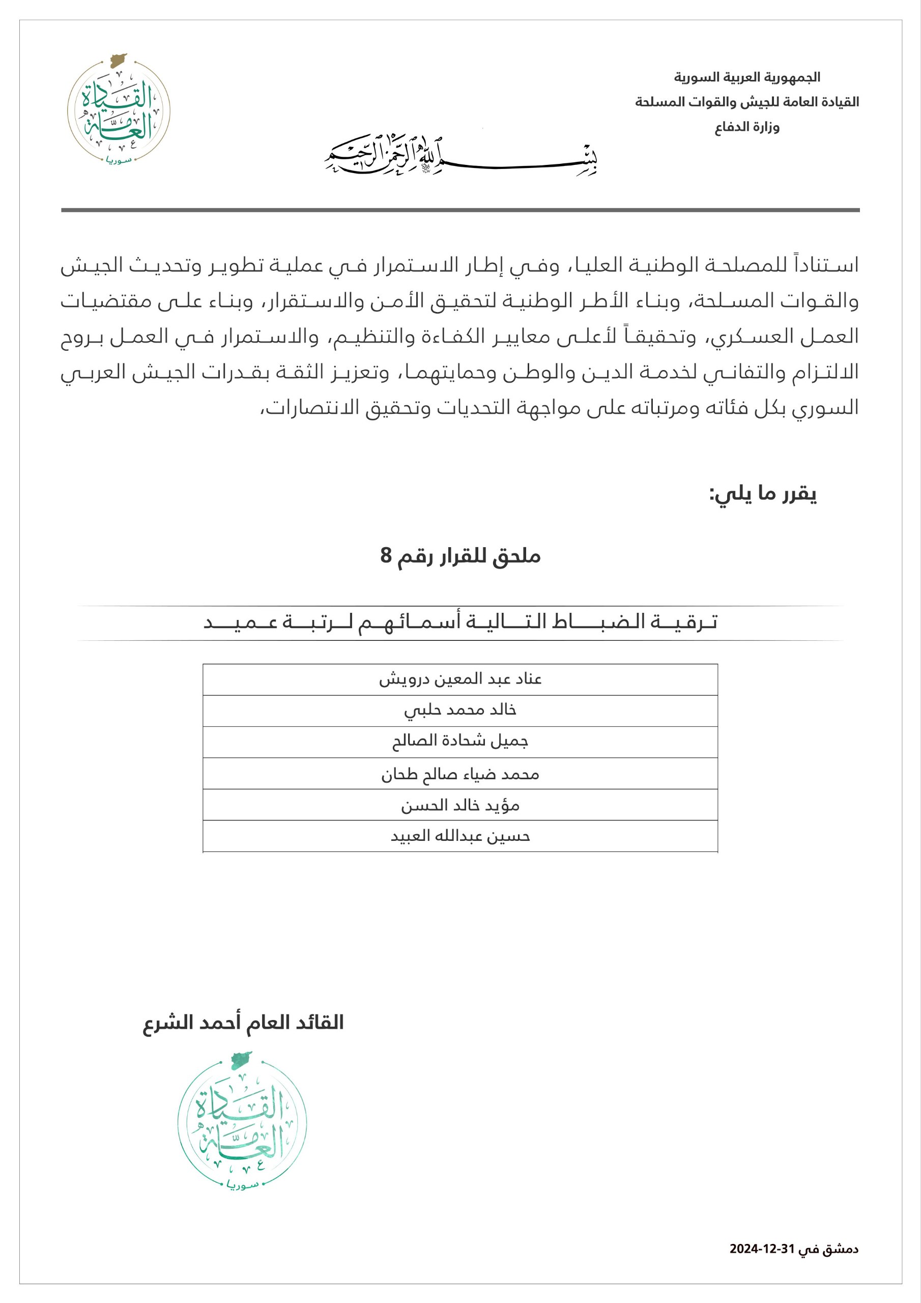 وثيقة رسمية صادرة عن القيادة العامة للجيش والقوات المسلحة تتضمن ملحقاً للقرار رقم 8، يقضي بترفيع عدد من الضباط إلى رتبة عميد، وذلك في إطار عملية تطوير وتحديث الجيش وتعزيز كفاءته، وتحمل تاريخ 31 كانون الأول/ ديسمبر 2024.