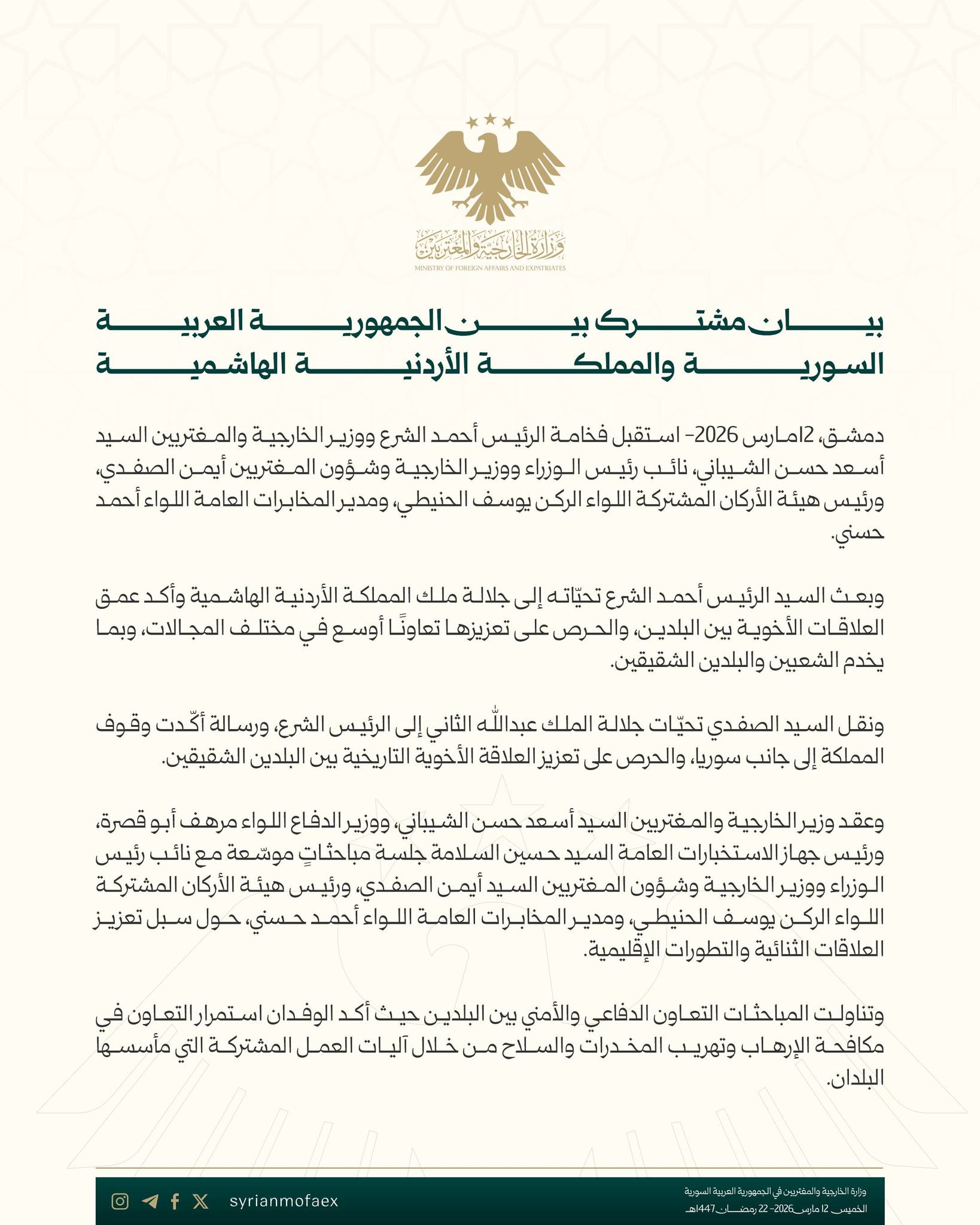وزارة الخارجية والمغتربين السورية: بيان مشترك مع المملكة الأردنية الهاشمية حول تعزيز العلاقات الثنائية والتطورات الإقليمية