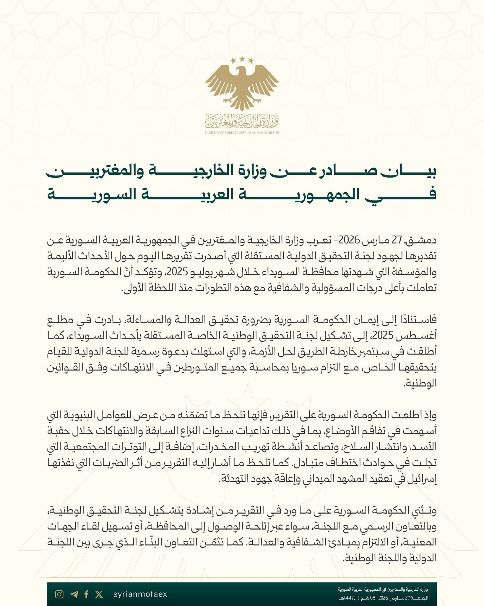 دمشق، 27 مارس 2026- تعرب وزارة الخارجية والمغتربين في الجمهورية العربية السورية عن تقديرها لجهود لجنة التحقيق الدولية المستقلة التي أصدرت تقريرها اليوم حول الأحداث الأليمة والمؤسفة التي شهدتها محافظة السويداء خلال شهري يوليو/آب 2025، وتؤكد أن الحكومة السورية تعاملت بأعلى درجات المسؤولية والشفافية مع هذه التطورات منذ اللحظة الأولى.