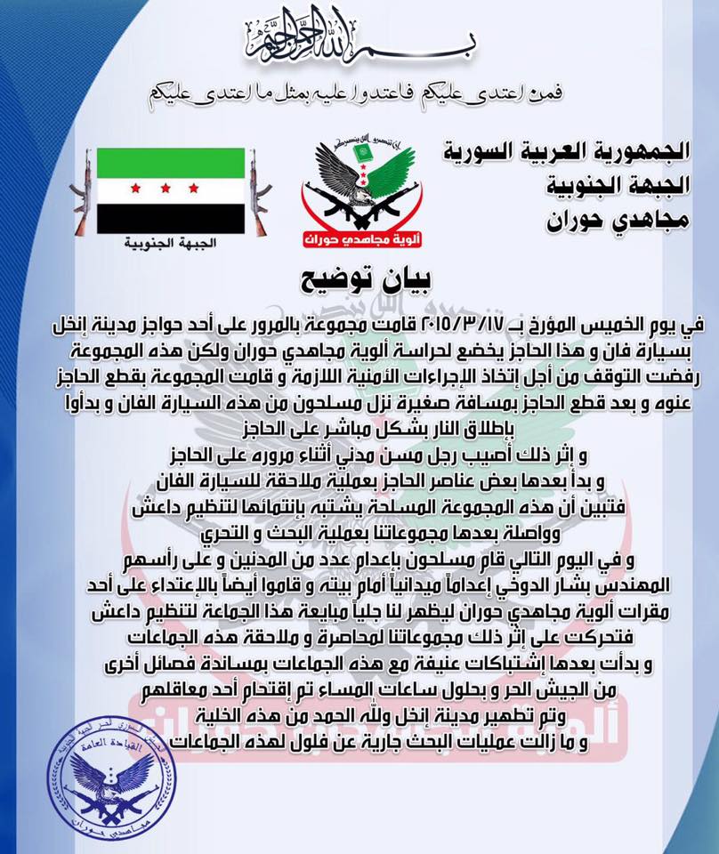 بيان تشكيل كتائب مجاهدي حوران التابعة للواء حمزة أسد الله في مدينة إنخل في ريف درعا