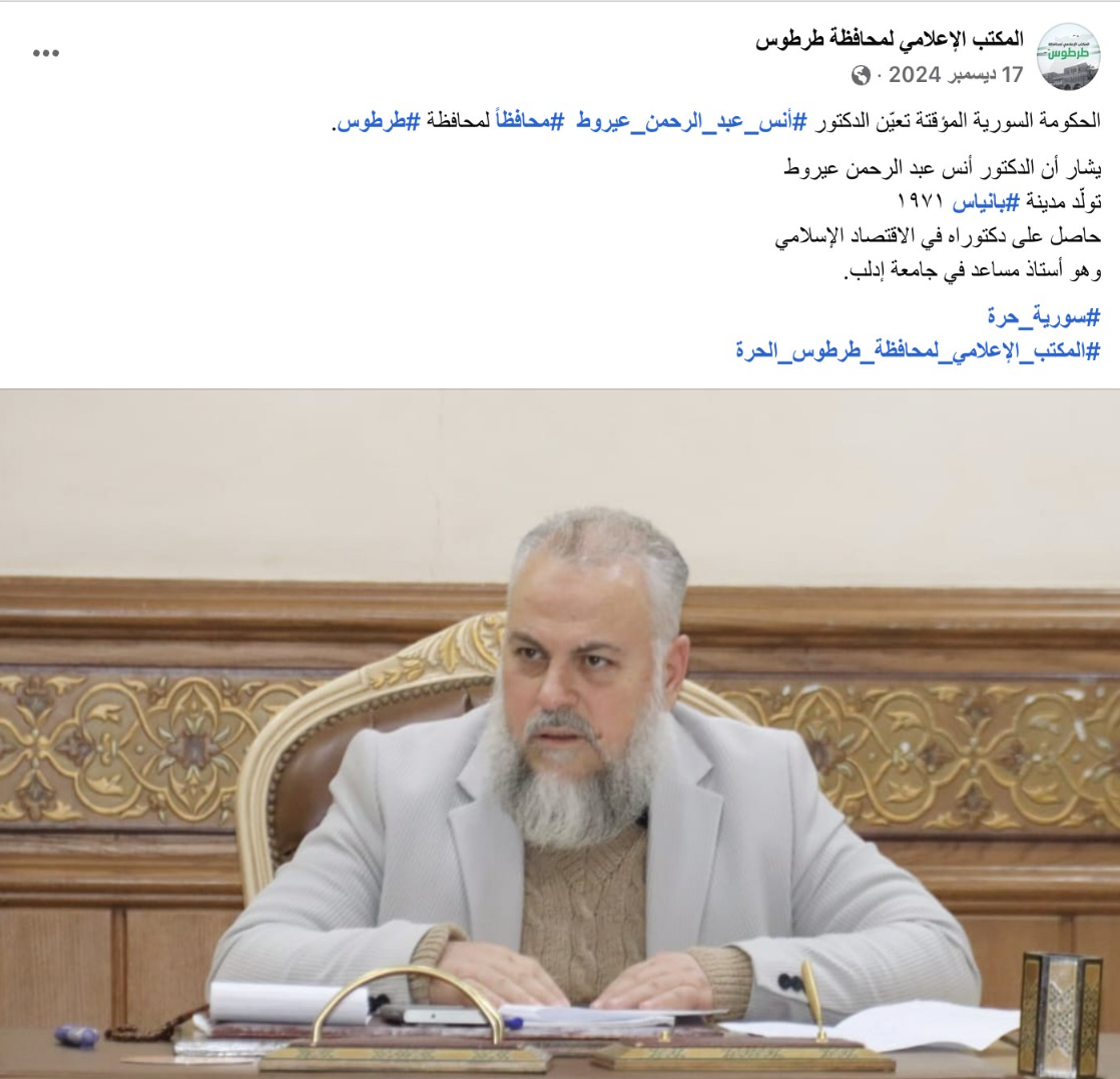 بعد سقوط نظام الأسد في 8 كانون الأول/ديسمبر 2024، أعلنت الحكومة السورية الجديدة تعيينه محافظًا لطرطوس بتاريخ 17