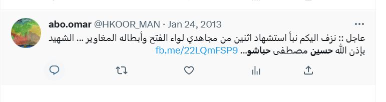 قتل خلال الاشتباكات مع قوات النظام على جبهة العامرية في مدينة حلب في 24 كانون الثاني/ يناير 2013.