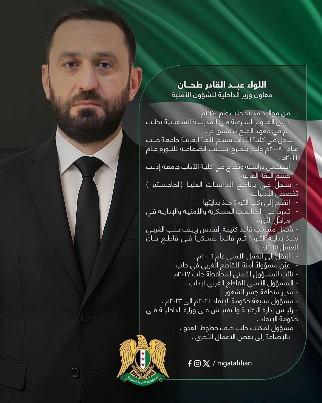 بعد سقوط النظام تولى قيادة جهاز الأمن العام في سورية.