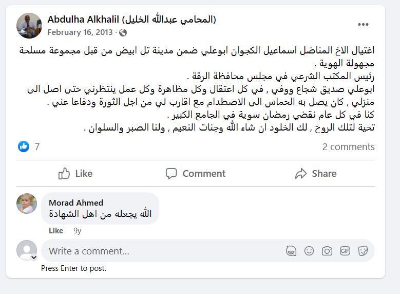 كان إسماعيل الكجوان، والمكنى بأبو علي، أحد أعضاء الهيئة الشرعية في مدينة تل أبيض والتي تأسست عقب سيطرة الجيش الحر على المدينة في أيلول/ سبتمبر 2012.