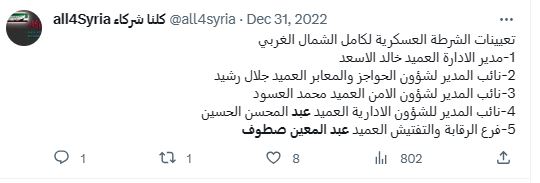 تم تعيينه رئيساً لقسم الرقابة والتنفتيش في الشرطة العسكرية التابعة للجيش الوطني في الشمال السوري في 31 كانون الأول/ ديسمبر 2022.