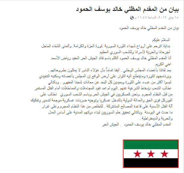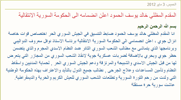 newscenter.news-المقدم خالد الحمود تصرفات النظام تدل على أن الجيش الحر قد أثر عليه والمسألة مسألة وقتبيان من المقدم المظلي خالد يوسف الحمود.PNGالمقدم المظلي خالد يوسف الحمود اعلن انضمامه الى الحكومة السورية الانتقالية.PNGkebreet.wordpress.com-المقدم خالد الحمود نرفض عسكرة المدنيين ونطالب بتسليح الجيشnbspالحركود الذاكرة السورية