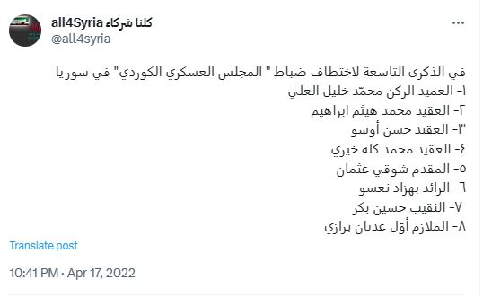 تم اعتقاله من قبل قوات حزب الاتحاد الديمقراطي PYD في 16 نيسان/ إبريل 2013 بالإضافة إلى سبعة ضباط آخرين من المجلس العسكري الكردي أثناء تواجدهم في مدينة القامشلي، ولا يزال مصيرهم مجولاً حتى الآن.