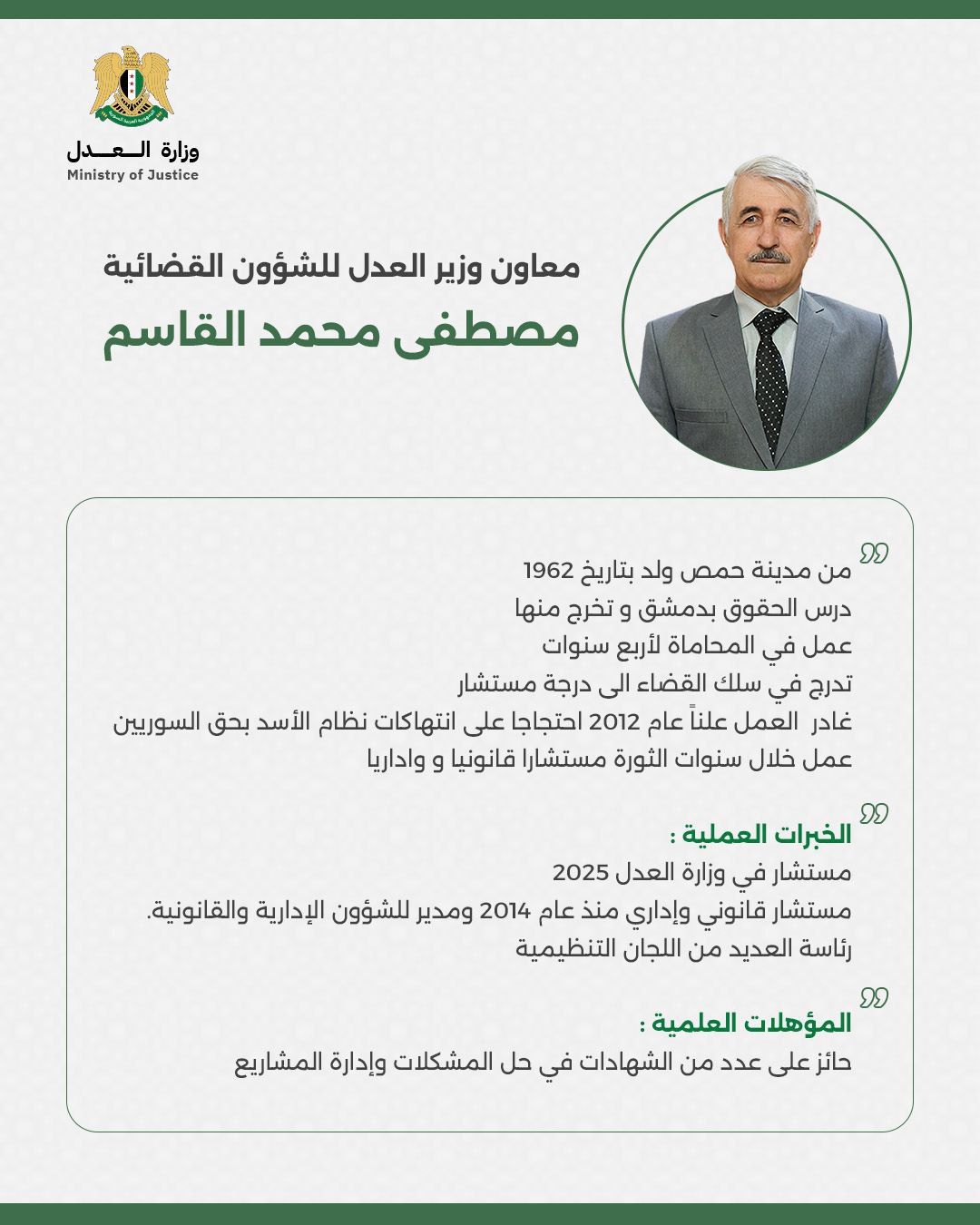 بتاريخ 31 أيار/ مايو 2025 صدر المرسوم الرئاسي رقم 64 لعام 2025 بتعيينه معاونًا لوزير العدل السوري للشؤون القضائية.
