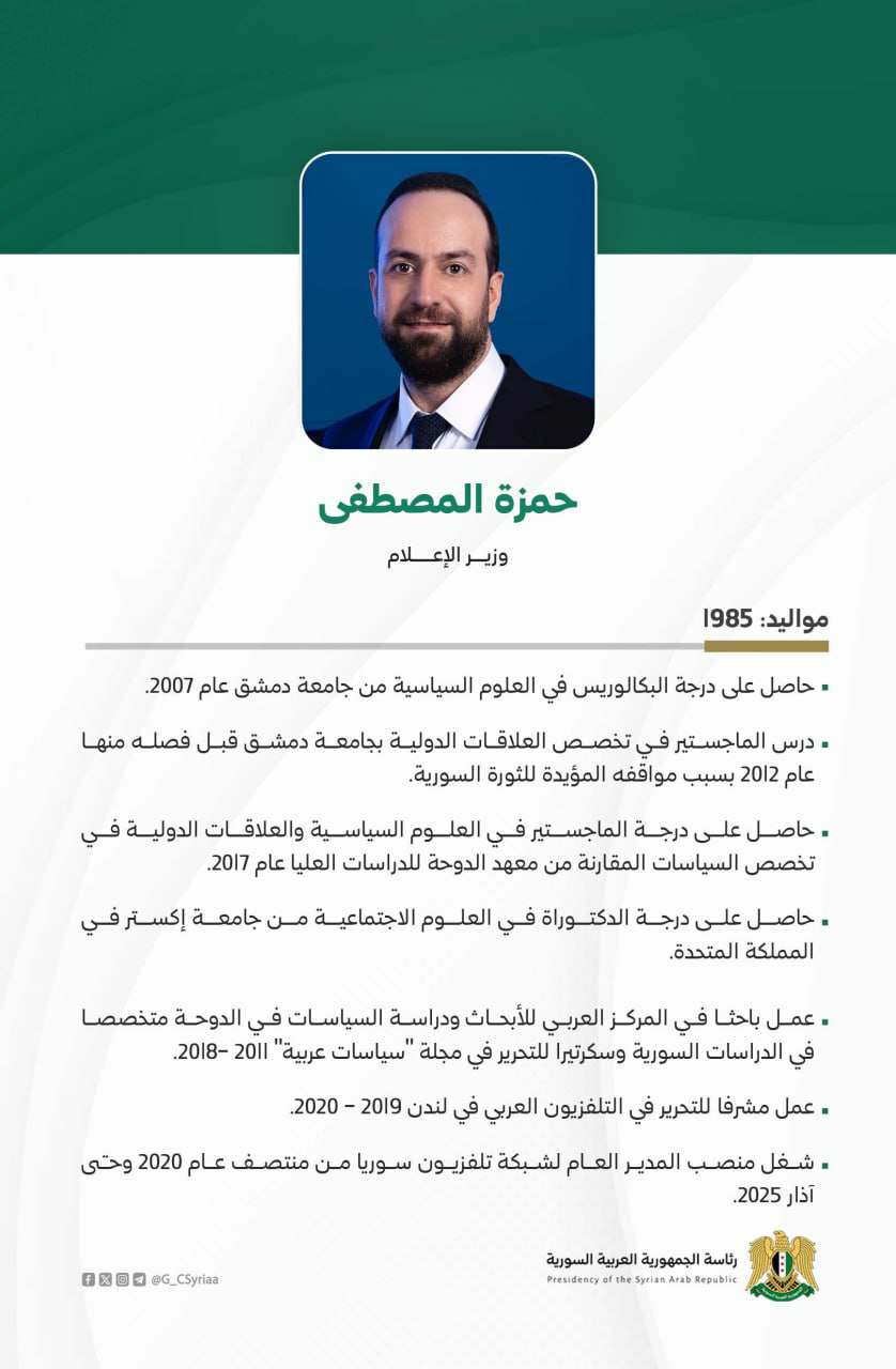 في 29 آذار/ مارس عُيّن وزيرًا للإعلام في الحكومة السورية الأولى برئاسة الرئيس أحمد الشرع.