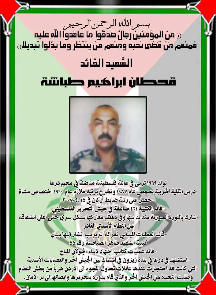 أعلن العقيد قحطان طباشة انشقاقه في 23 تموز/يوليو 2012 عن مرتبات الكتيبة 421 صاعقة العاملة ضمن لواء القادسية في جيش التحرير الفلسطيني في السويداء، وقام بتشكيل كتائب الجيش الفلسطيني الحر العاملة في جنوب سوريا.