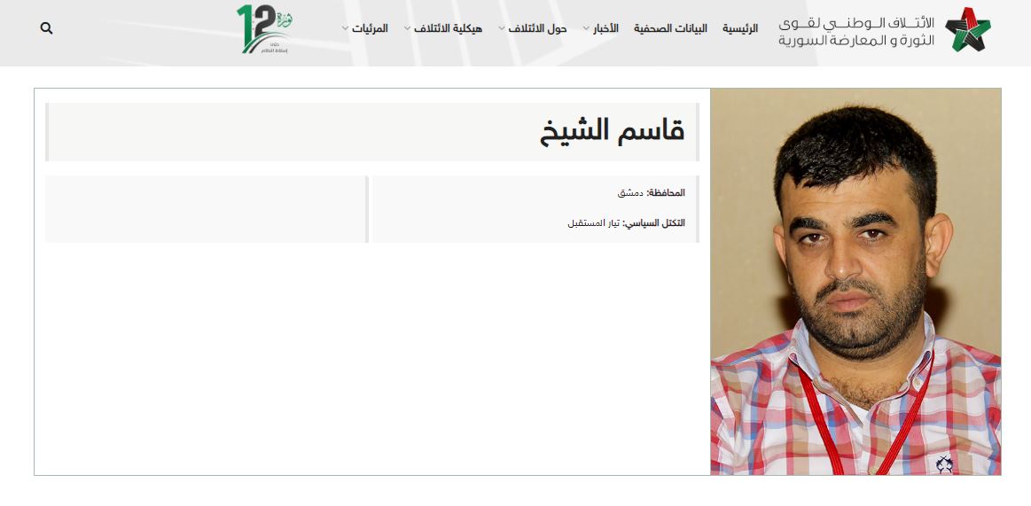 انضم قاسم الشيخ إلى الائتلاف الوطني ممثلاً عن كتلة الأركان عن محافظة السويداء في حزيران/ يونيو 2013، واستمر في عضويته حتى إقالته في 15 آب/أغسطس 2014. بحسب موقع الائتلاف فقد كان الشيخ عضواً في كتلة تيار المستقبل ضمن الائتلاف.