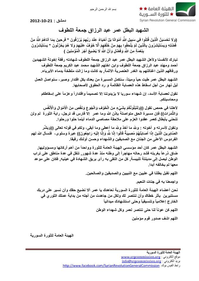 في 20 تشرين الأول/أكتوبر 2012، أعدمت قوات النظام عمر عبد الرزاق اللطوف ميدانيًا، برفقة أخويه وابن أخته الناشط الإعلامي محمد اللطوف، بعد اعتقالهم خلال عبورهم حاجزًا أمنيًا لقوات النظام في منطقة الإيكاردا جنوب حلب قبل يومين من ذلك، وأكدت الشبكة السورية لحقوق الإنسان خبر إعدامهم ميدانيًا بعد تعرضهم للتعذيب.