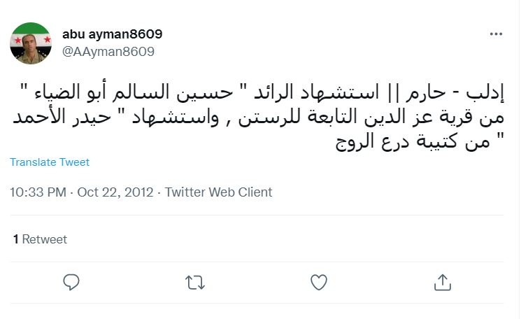 قتل في معركة تحرير مدينة حارم في 22 تشرين الأول/ أكتوبر 2012.