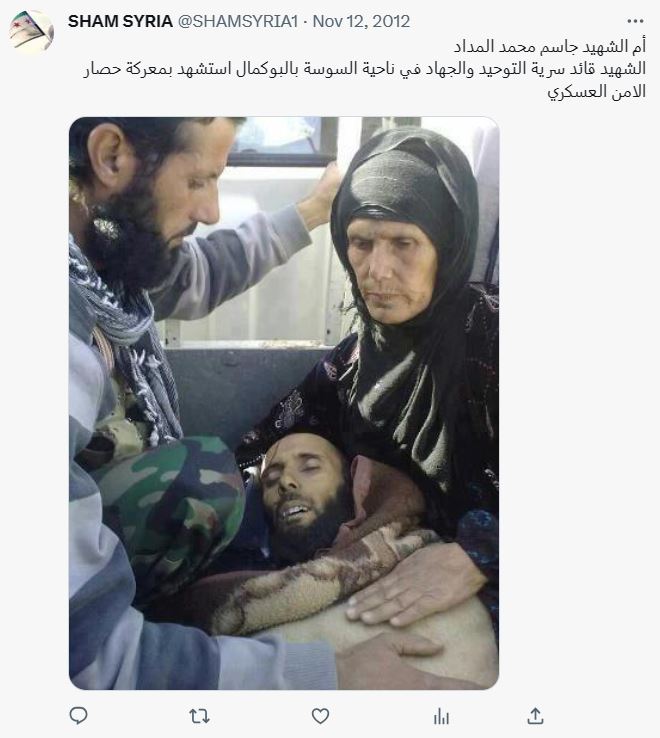 قاد جاسم محمد المداد سرية العاليات العاملة في منطقة البوكمال في ريف دير الزور الشرقي، والتي نشطت تحت مسمى كتيبة العاليات منذ 23 تموز/ يوليو 2012، وانضمت إلى كتيبة التوحيد والجهاد عند تأسيسها في 28 آب/ أغسطس 2012.