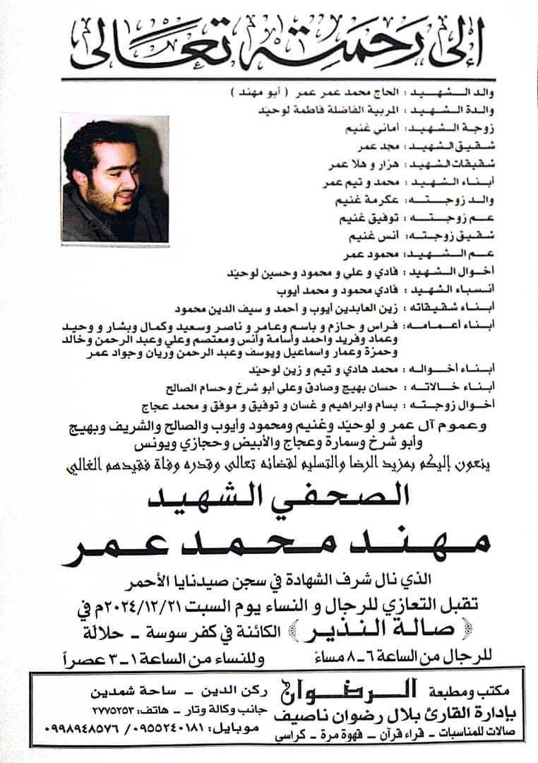 وكتبت والدته فاطمة لوحيد، وهي المنسقة العامة لحملة الكشف عن مصير المعتقلين والمغيبين الفلسطينيين في سجون نظام الأسد، في نعي ابنها مهند عمر: