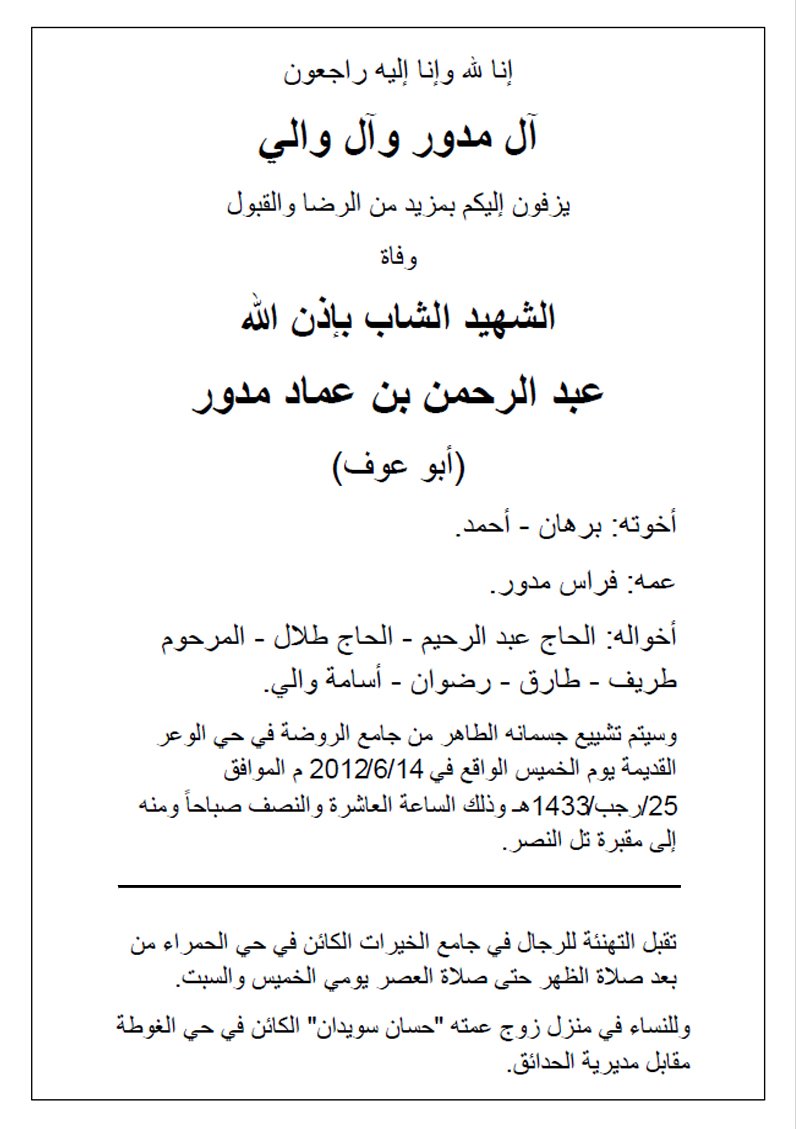 وفي 19 حزيران/يونيو 2012 خرجت مظاهرات في حي الوعر بمدينة حمص تحت شعار "ثلاثاء الوفاء للشهيد البطل عبد الرحمن مدوّر".