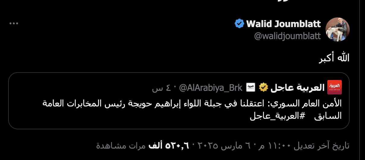 بعد سقوط نظام الأسد، وفي مساء يوم الخميس 6 آذار/مارس 2025، أعلنت إدارة الأمن العام التابعة لوزارة الداخلية في الحكومة السورية الجديدة إلقاء القبض على إبراهيم حويجة خلال عملية أمنية في مدينة جبلة.