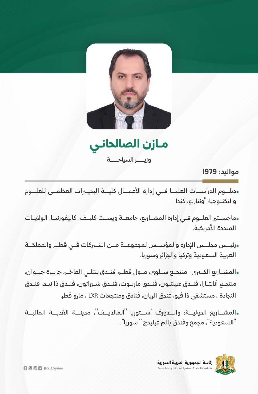 في 29 آذار/ مارس 2025 عُيّن مازن الصالحاني وزيرًا للسياحة في الحكومة السورية الأولى برئاسة الرئيس أحمد الشرع.