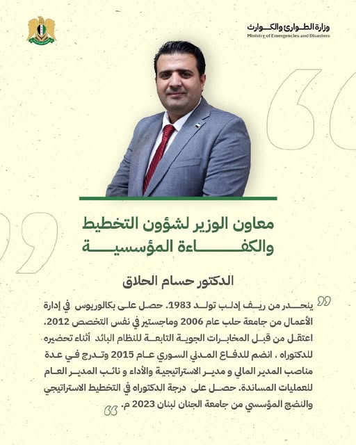 معاون وزير الطوارئ والكوارث السوري لشؤون التخطيط والكفاءة المؤسسية منذ أيار/ مايو 2025.
