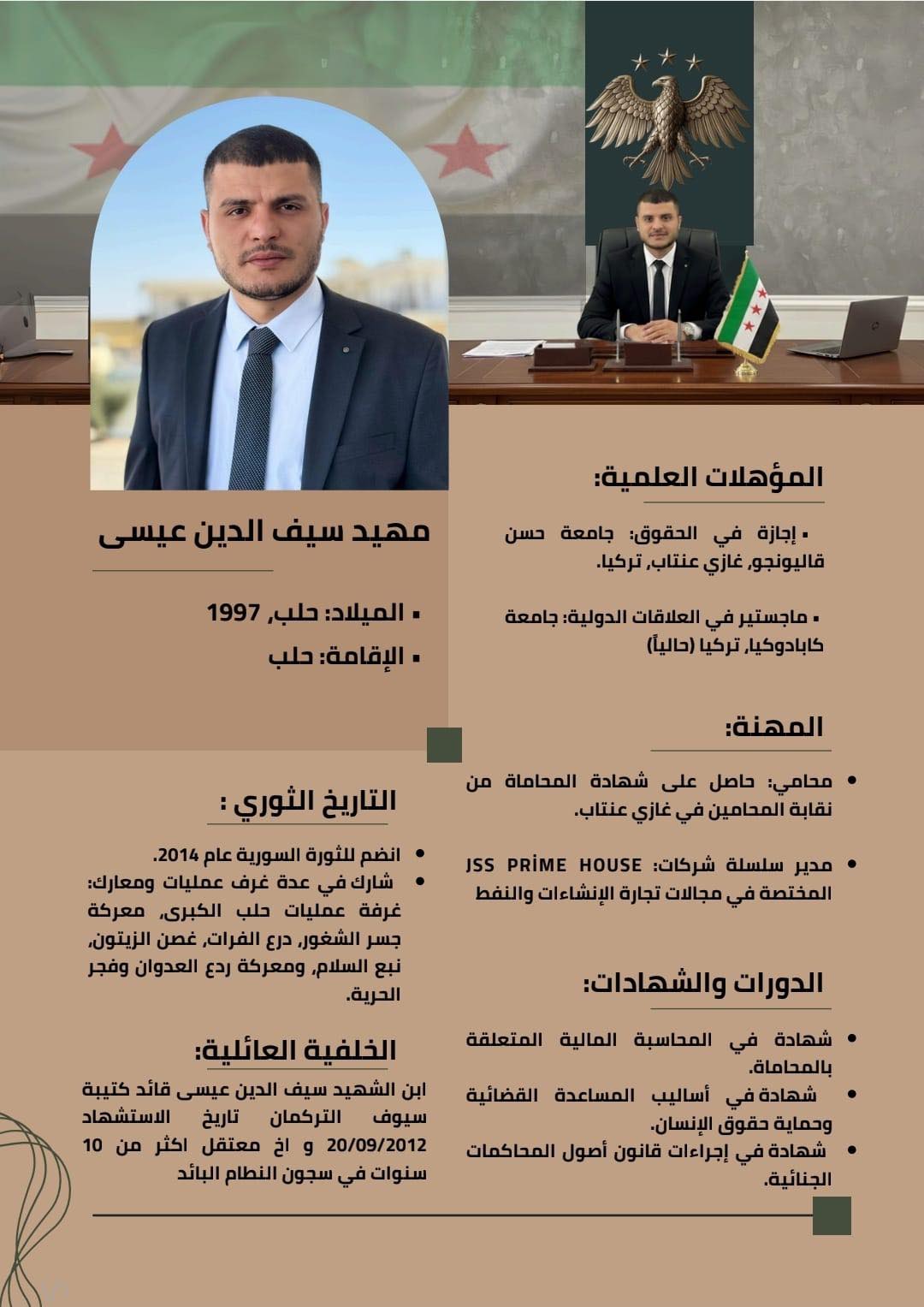 بعد الثورة السورية، فقد والده سيف الدين عيسى، الذي كان قائد "كتيبة سيوف التركمان" وقُتل في المعارك ضد قوات النظام بتاريخ 20 أيلول/ سبتمبر 2012.