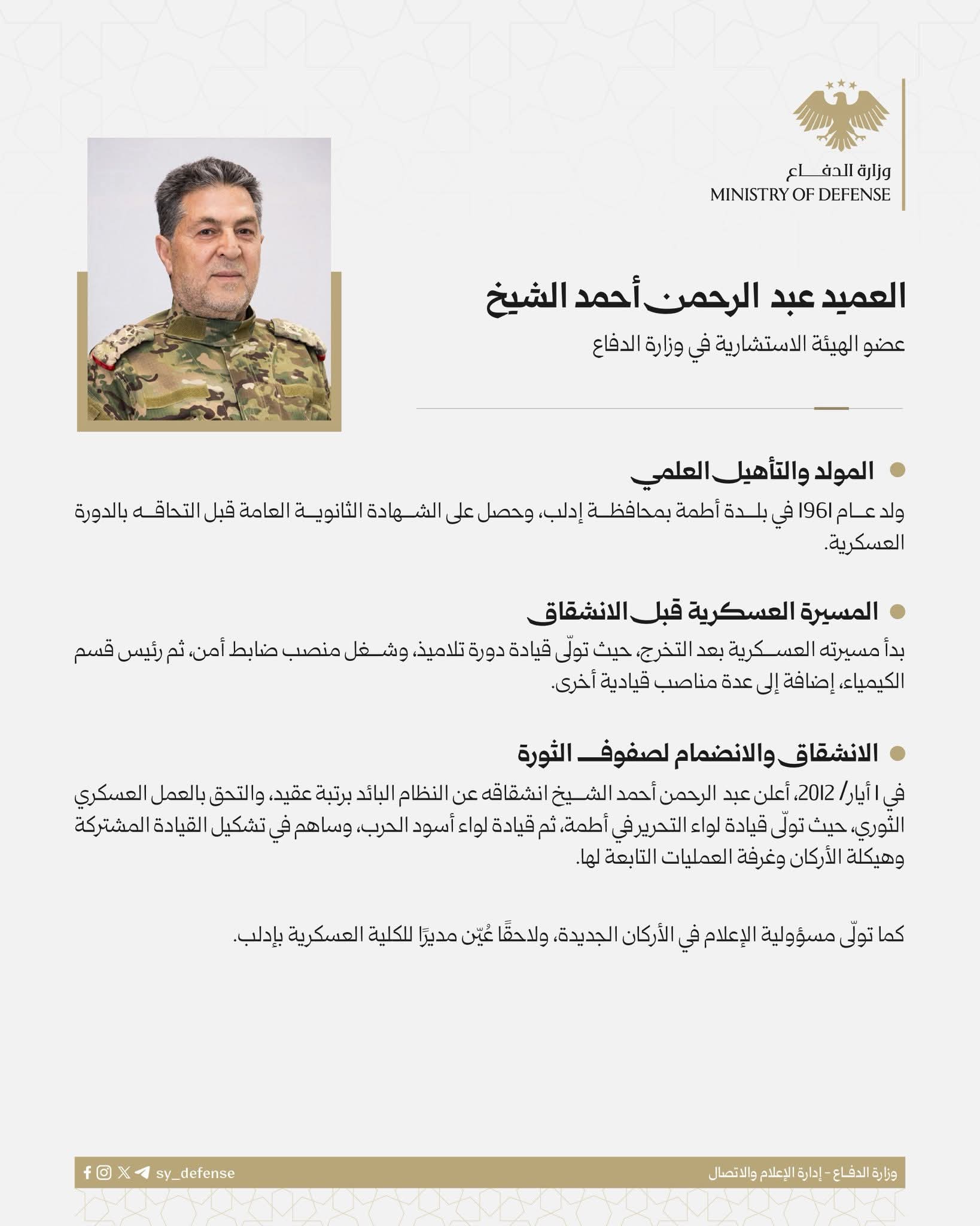 عضو الهيئة الاستشارية في وزارة الدفاع السورية منذ 29 آذار/ مارس 2026.