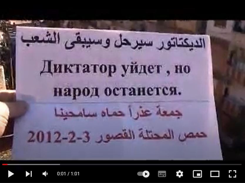 وحمل المتظاهرون لافتات "لن نتراجع الثورة ثورتنا" و"عذرًا حماة سامحينا" إضافة إلى لافتات باللغة الروسية تطالب برحيل النظام.