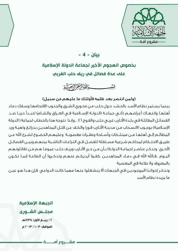 في حين لم يصدر عن "الجبهة الإسلامية" موقف رسمي سوى مطالبة "داعش" بوقف الهجوم على الأتارب.