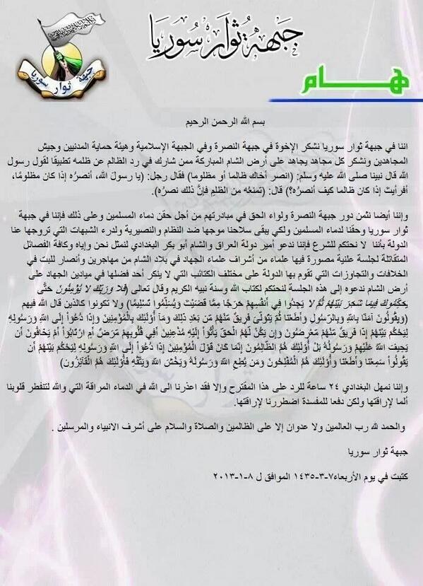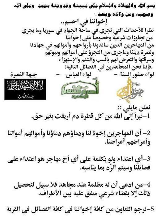 وأصدرت كتائب تابعة لفصائل "جبهة النصرة" و"أحرار الشام" و"صقور الشام" بيانًا مشتركًا حذرت في من الإساءة للمهاجرين والاعتداء على من اعتزل منهم القتال، وذلك بعد انتشار أنباء عن إعدام "جبهة ثوار سوريا" العشرات ورمي جثثهم في الآبار، في حين أصدرت "جبهة ثوار سوريا" بيانًا أعلنت فيه قبول مبادرة "جبهة النصرة"، ودعت زعيم "داعش" البغدادي إلى جلسة علنية مصورة بحضور "أشراف علماء الجهاد في بلاد الشام" للبتّ في الخلافات والتجاوزات التي تقوم بها "الدولة".