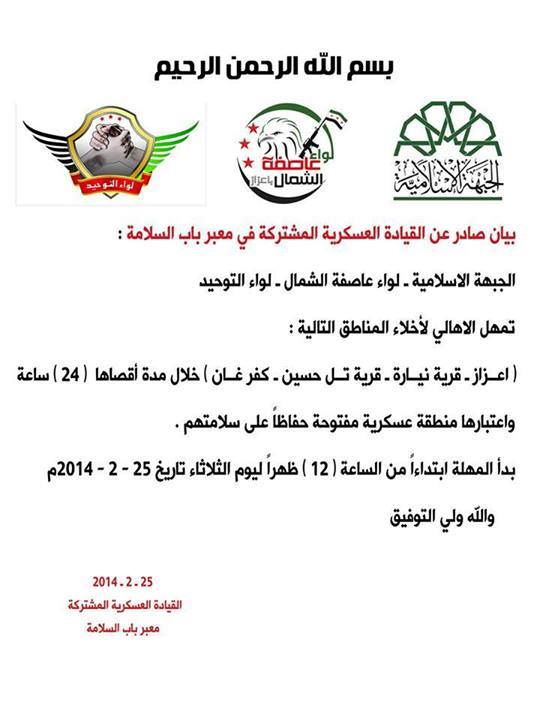 من جانب آخر، أعلن "لواء التوحيد" و"لواء عاصفة الشمال" مدينة اعزاز وقرى نيارة وتل حسين وكفر غان مناطق عسكرية، تمهيدًا لطرد تنظيم "داعش" منها، وسيطرت الفصائل الثورية على قرية كفرنايا عقب اشتباكات ضد التنظيم.